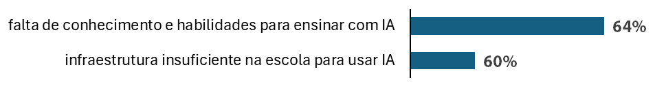 Entre as/os docentes que relataram não ter utilizado IA em suas práticas pedagógicas, a maioria afirmou não possuir o conhecimento e as habilidades necessárias para ensinar com IA, além de apontar que suas escolas não dispõem de infraestrutura adequada para essa finalidade.