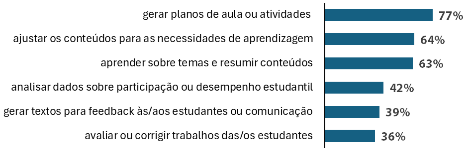 A maioria das/os professoras/es da escola básica brasileira que utilizam IA declarou empregá-la para gerar planos de aula e atividades para as/os estudantes, ajustar automaticamente o nível de dificuldade dos conteúdos de acordo com as necessidades de aprendizagem das/os estudantes, e aprender sobre temas ou resumir conteúdos de forma eficiente. Muitas/os docentes também afirmaram ter utilizado a IA para analisar dados sobre a participação ou o desempenho estudantil, gerar textos para feedback às/aos alunas/os ou comunicação com pais/mães ou responsáveis, e avaliar ou corrigir trabalhos de estudantes.