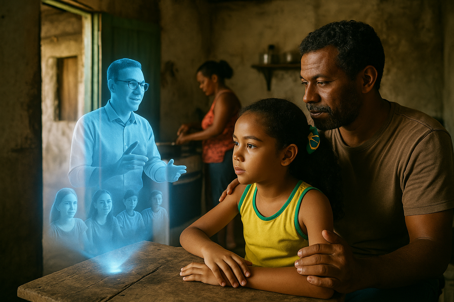 Prompt: “Crie uma imagem fotográfica representando uma menina brasileira em uma casa muito pobre, olhando para um holograma que projeta um avatar de professor. Também são projetados outros estudantes, como se estivessem juntos no espaço virtual compartilhado. O pai da criança participa com ela da aula virtual dando apoio para a aprendizagem, enquanto a mãe está cozinhando.”