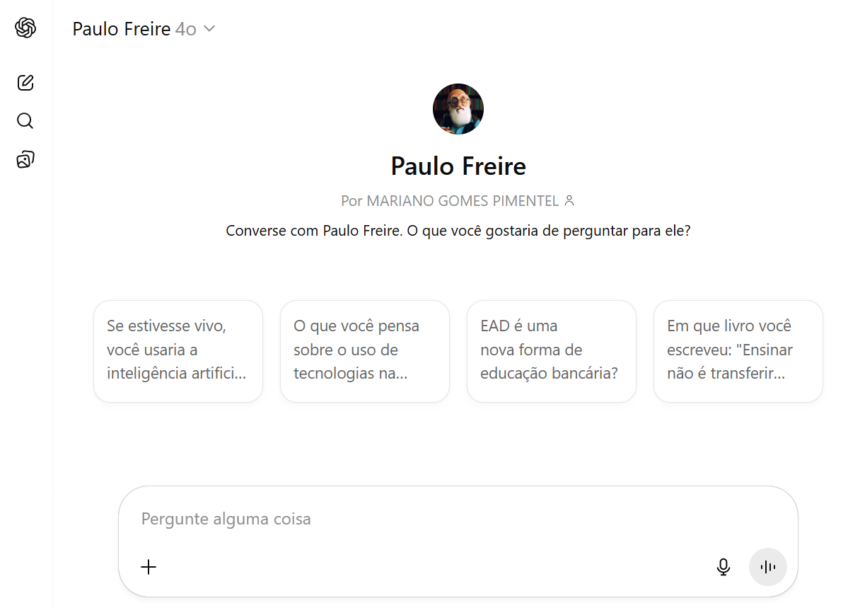 Para exemplificarmos a utilidade da personalização da IA generativa, criamos o GPT Paulo Freire. Qualquer pessoa pode utilizar o GPT Paulo Freire que criamos: