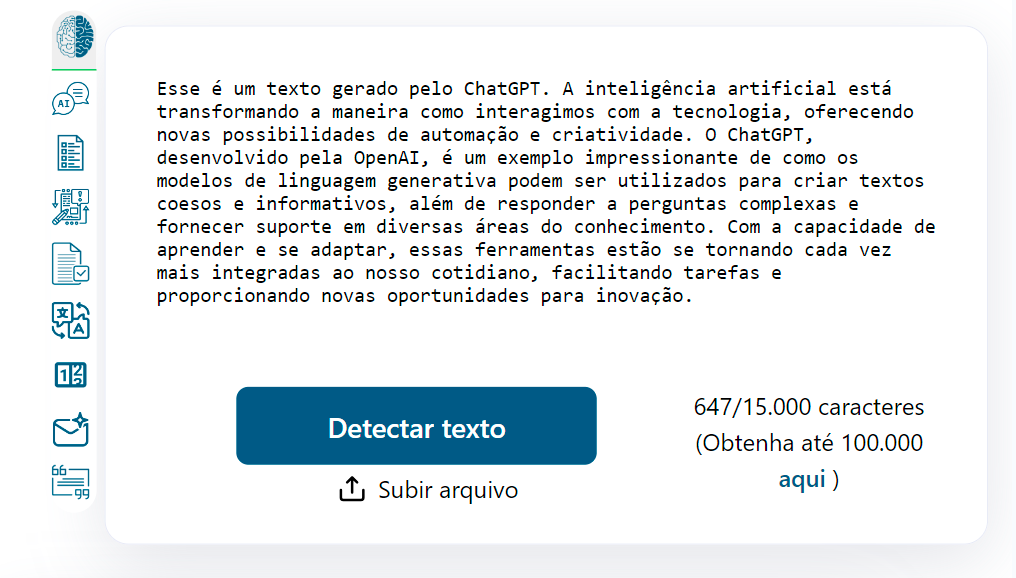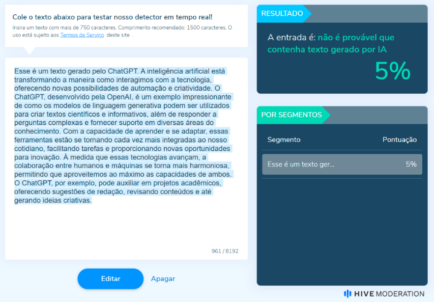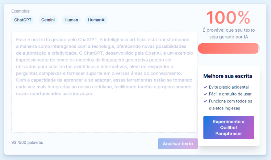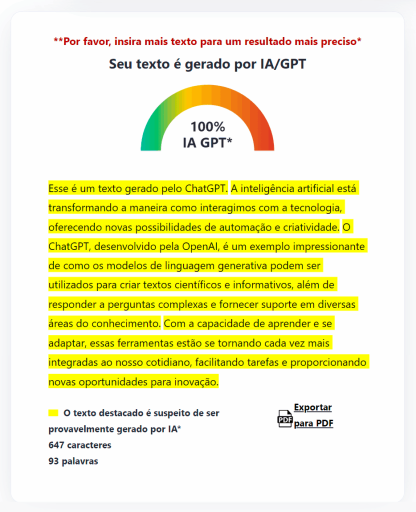 A seguir, apresentamos a análise de alguns detectores de IA aplicada a um texto gerado pelo ChatGPT. Dois detectores identificaram corretamente que o texto havia sido gerado por IA, enquanto um terceiro o classificou equivocadamente como sendo de autoria humana.