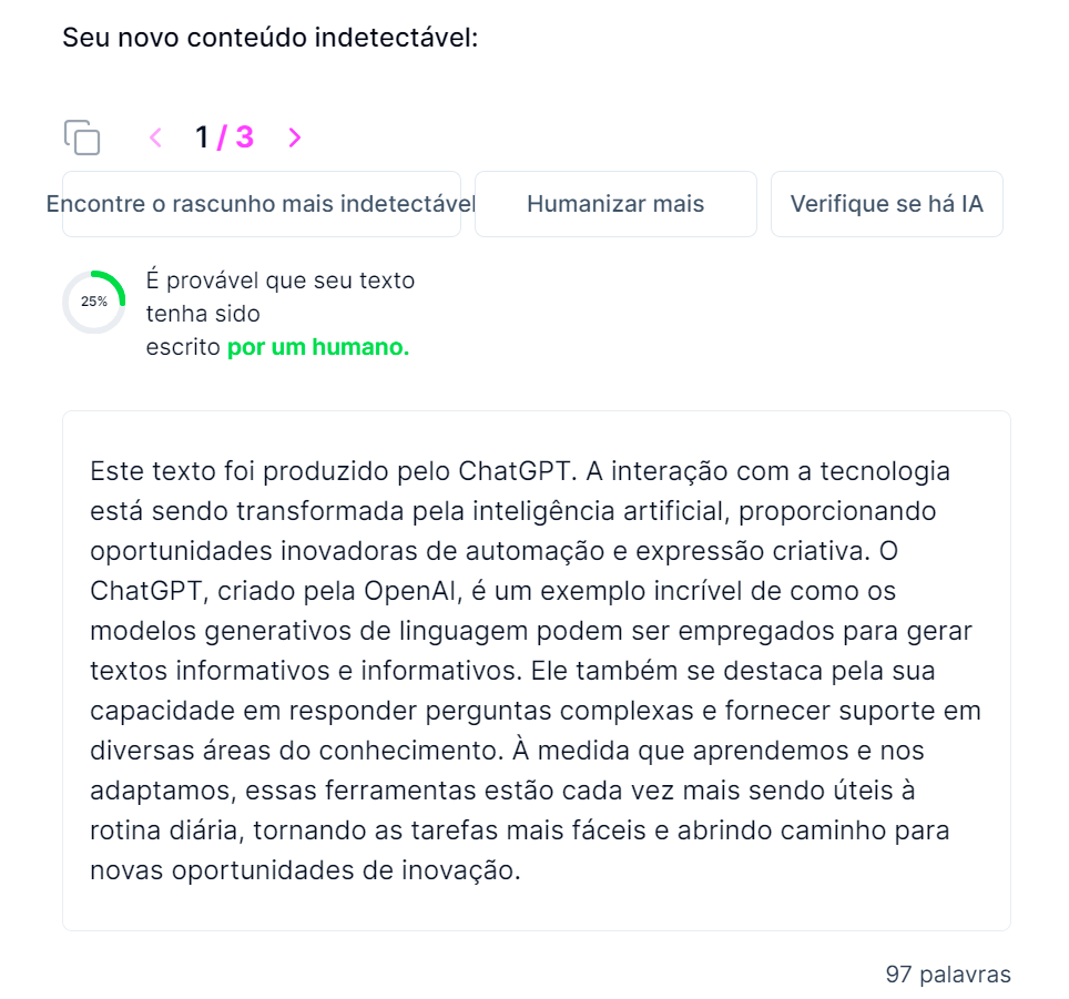 Com a popularização dos detectores de IA, foram desenvolvidos sistemas para “humanizar” textos gerados por IA. Esses sistemas modificam o texto com o objetivo de enganar os detectores, introduzindo propositalmente alguns erros e alterando o estilo de escrita, o tom e a fluidez da redação. Como resultado, um texto “humanizado” pode ser erroneamente classificado pelos detectores como de autoria humana. Utilizamos um desses sistemas de humanização para modificar o texto gerado pelo ChatGPT, e, de fato, o novo texto gerado foi classificado como “escrito por um humano”. A conclusão é que a detecção de textos gerados por IA é falível e pode ser facilmente enganada com o uso de sistemas que “humanizam” o conteúdo.