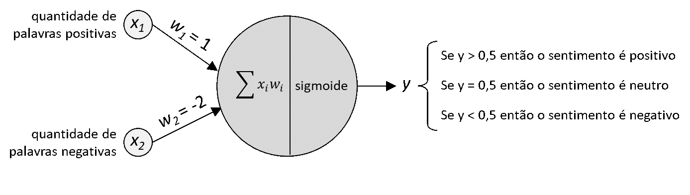 Nosso exemplo de neurônio artificial utiliza dois dados de entrada: a quantidade de palavras positivas (x1 = 3) e a quantidade de palavras negativas (x2 = 1). Suponhamos que, a partir de um treinamento anterior, o neurônio tenha aprendido que: as palavras positivas têm peso 1 (w1 = 1), as palavras negativas têm peso -2 (w2 = -2) e o viés é igual a zero (b = 0). Os pesos associados a cada entrada determinam a importância relativa das palavras positivas e negativas na classificação final do sentimento expresso no texto. O neurônio, então, realiza a soma ponderada: ∑xi·wi = (3 · 1) + (1 · -2) = 1. O resultado desse somatório é ajustado pelo viés, que neste caso é zero, de modo que o valor permanece igual a 1.