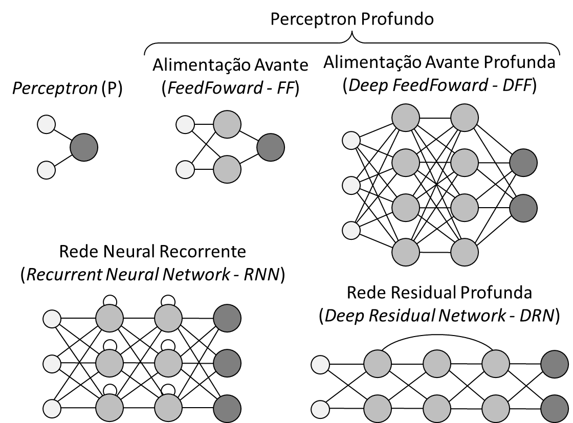 As redes neurais artificiais são organizadas em camadas. Uma forma comum de organizar os neurônios é conectar cada neurônio de uma camada a todos os neurônios da camada seguinte, topologia denominada Multilayer Perceptron (MLP) ou Rede Neural Profunda de Propagação Direta (Deep Feed-Forward Network), ilustrada na figura a seguir.