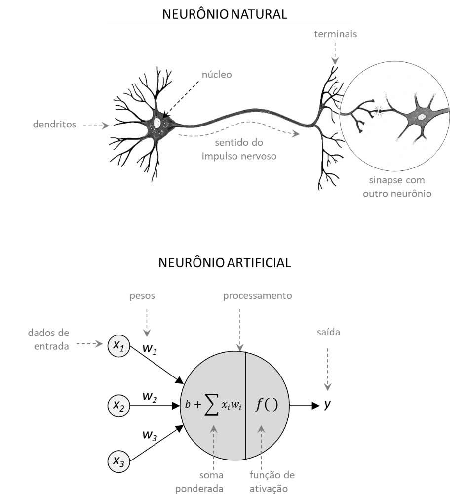 Tomando o neurônio biológico como referência, o neurônio artificial foi modelado por meio de uma equação matemática simples: