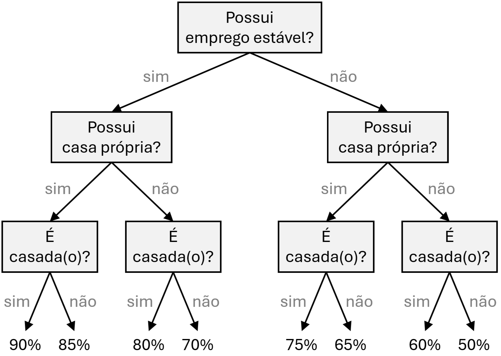 Percorremos (ou lemos) uma árvore de decisão de cima para baixo. Cada nó interno representa um teste condicional (“SE”) baseado em um atributo. No exemplo apresentado, o primeiro teste da árvore (o nó-raiz) verifica se a pessoa possui emprego estável. A resposta a esse teste determina o caminho a seguir: se a condição for satisfeita, seguimos para o ramo à esquerda; caso contrário, seguimos para o ramo à direita. Esse processo continua até alcançarmos um nó-folha (ou terminal), que contém a informação final desejada. Por exemplo, uma pessoa que tem emprego estável, possui casa própria e é casada tem 90% de probabilidade de quitar o empréstimo. Já uma pessoa que não tem emprego estável, possui casa própria e não é casada tem uma probabilidade de 65% de quitar o empréstimo. Esse tipo de modelo pode ser útil para apoiar decisões como conceder ou negar um empréstimo, ou para estimar o valor do seguro associado ao empréstimo. O objetivo de uma árvore de decisão é construir um modelo capaz de prever o valor de uma variável de destino (como a probabilidade de quitar um empréstimo), com base em várias variáveis de entrada (como emprego estável, propriedade de imóvel e estado civil).