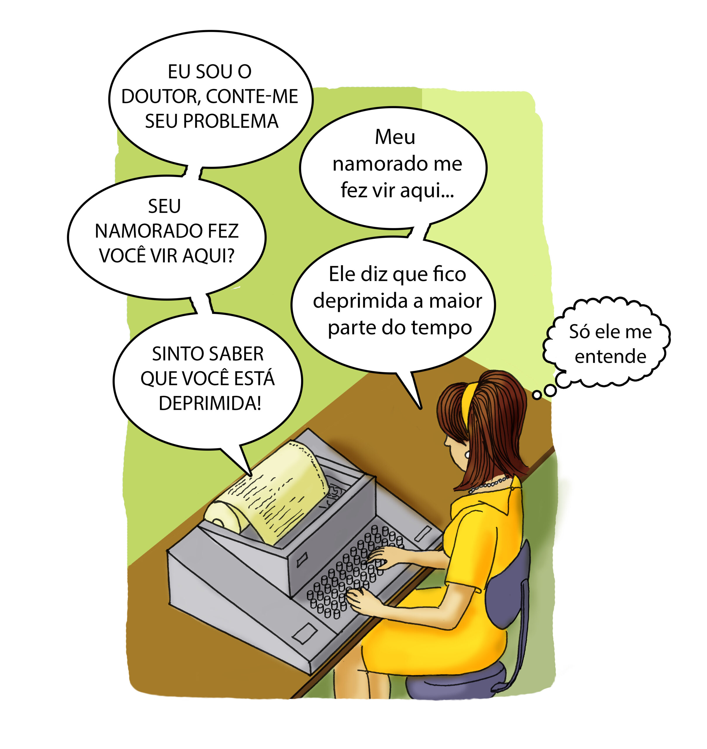 COMO VOCÊ VAI? EU SOU O DOUTOR. POR FAVOR, SENTE-SE AO TELETIPO E CONTE-ME SEU PROBLEMA.