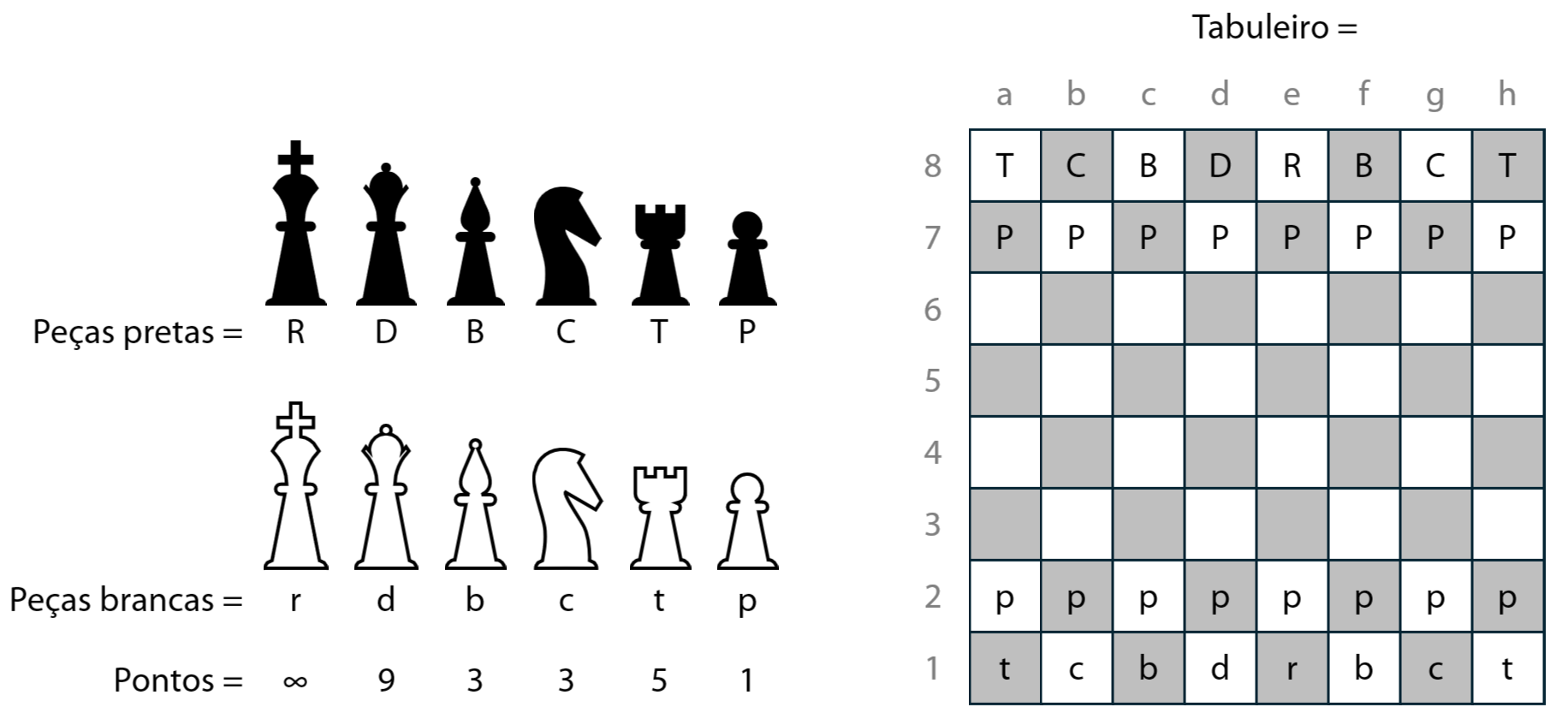 Podemos representar um tabuleiro de xadrez por meio de uma tabela composta por 8 linhas e 8 colunas, também chamada de matriz 8×8. As peças do tabuleiro podem ser representadas por letras: R representa o Rei; D, a Dama (ou rainha); B, o Bispo; C, o Cavalo, T, a Torre, e P, o Peão. Letras em maiúsculo representam peças pretas, enquanto letras em minúsculo representam peças brancas. As representações das peças devem ser posicionadas na matriz conforme sua disposição real no tabuleiro. A ausência de um caractere indica que a casa está vazia.